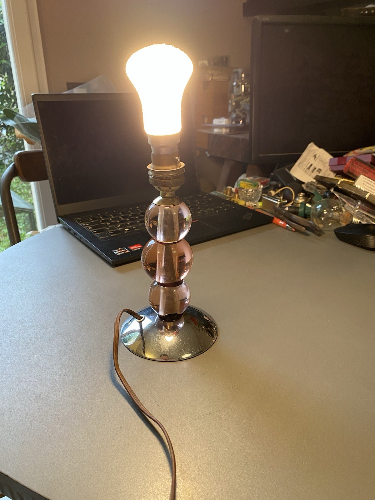 Ancien pied de lampe art déco Jacques ADNET? boules verre rose chrome vintage
