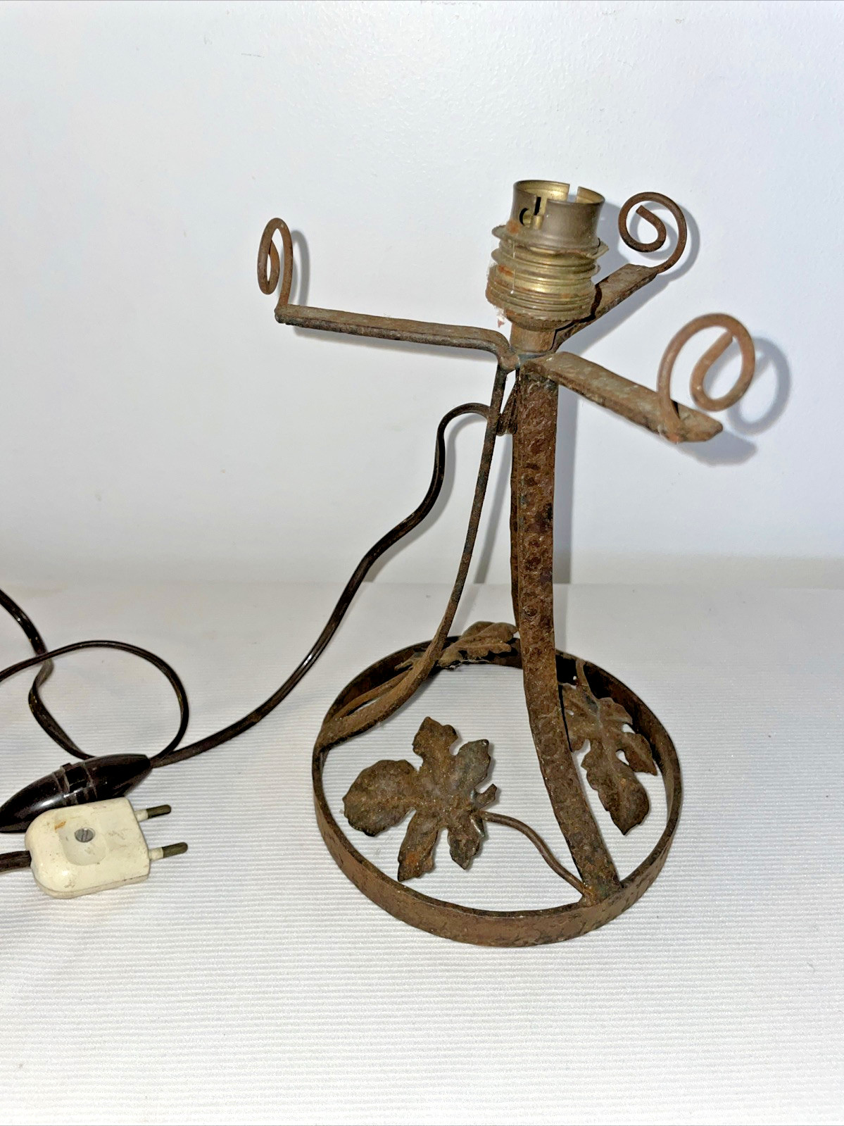 Ancien Pied de lampe en fer forgé , art déco , feuille , 19 cm +4cm douille