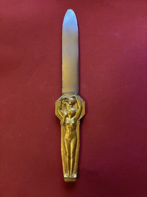 Antique Lettre Ouvreur Bronze Art Déco Doré Signé Lucien Bazor 1928 25 Cm