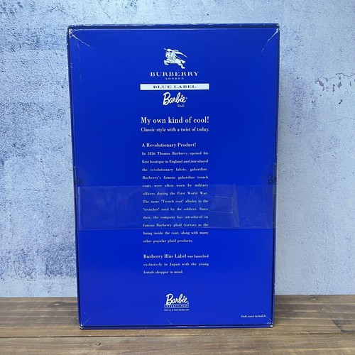 Intitulée « Burberry Blue Label », cette tenue est une reproduction fidèle des créations de la marque de luxe britannique. La poupée Barbie est vêtue d’un manteau en trench-coat bleu marine, avec un col en velours et des boutons en métal. Le manteau est accompagné d’un pantalon en coton bleu clair, avec une ceinture en cuir noir et des chaussures en cuir noir à talons.
