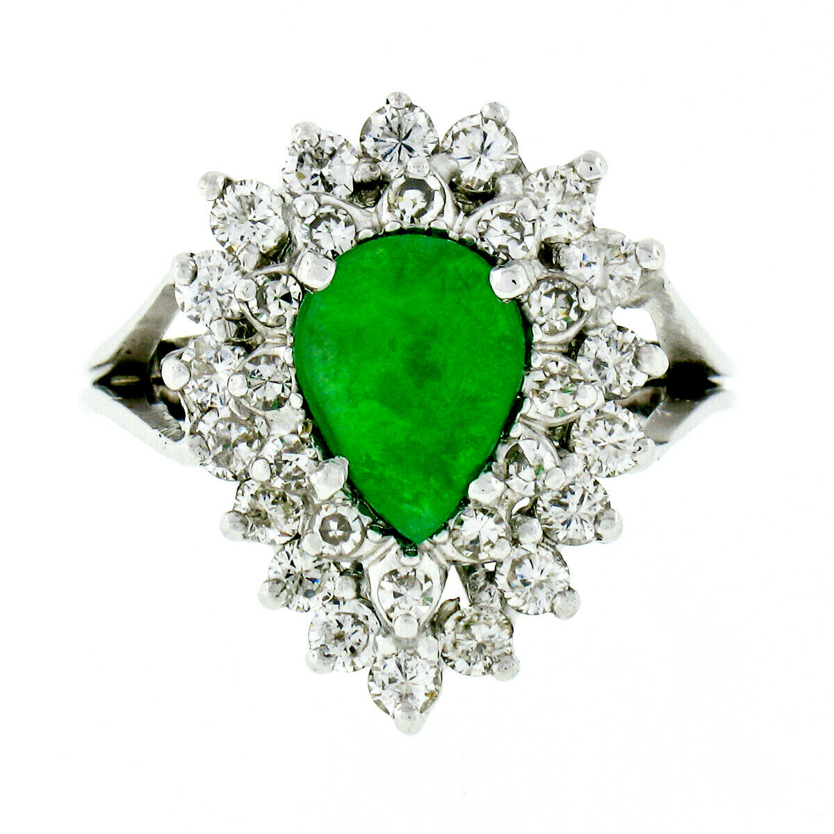 Estate 14k White Gold Pear Cabochon Jade .72ctw Dual Diamond Halo Cocktail Ring