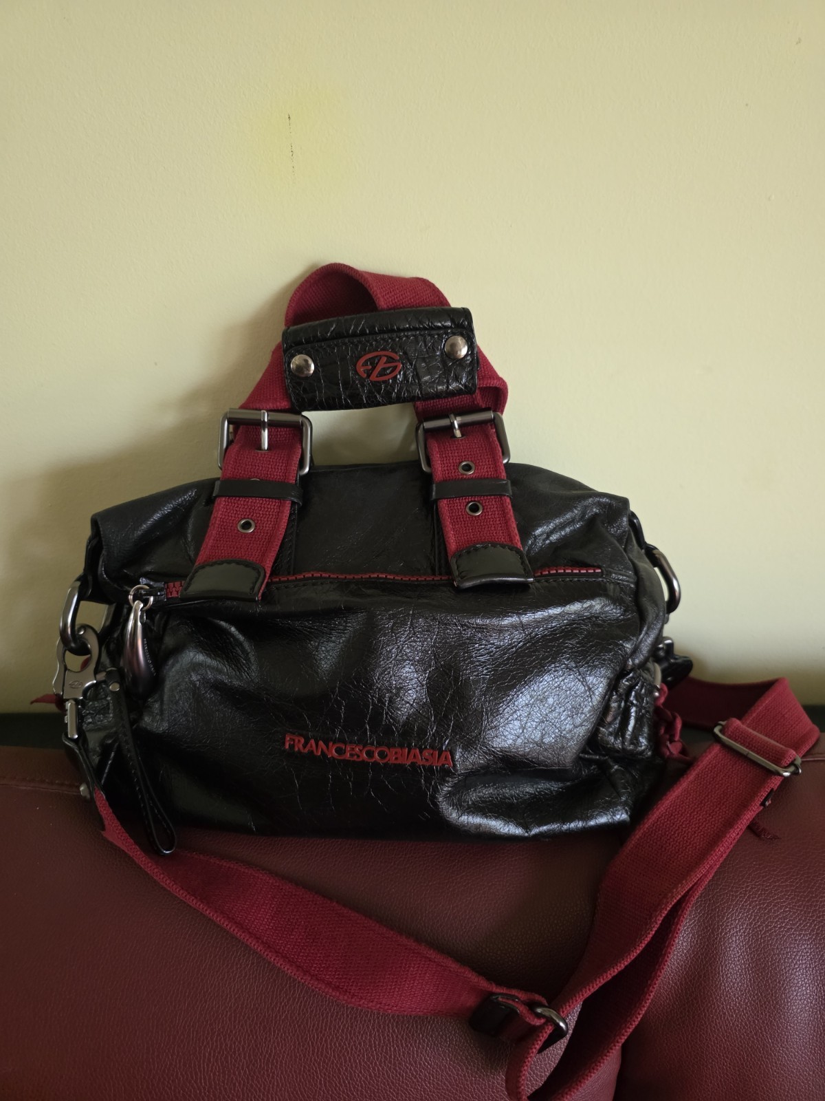 Francesco Biasia Satchel Crossbody Bag Black Patent Leather Red Trim Top Zip EUC