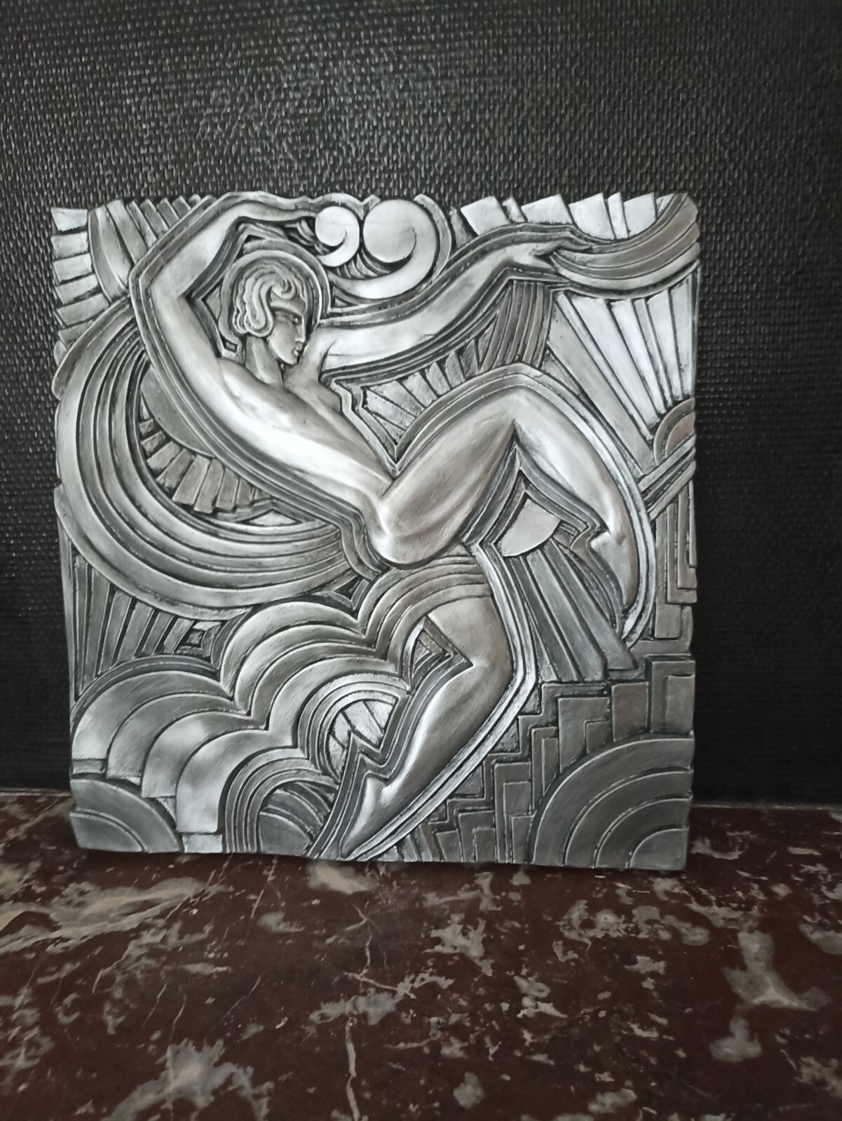Le Grand Bas-relief Art déco « Folies bergère » en argent est une pièce unique qui mesure plusieurs dizaines de centimètres de diamètre. Il est réalisé en argent massif, ce qui lui confère une texture lisse et brillante. Les détails de la femme, de son visage et de ses vêtements, sont finement ciselés, tandis que les motifs géométriques et les lignes courbes qui l’entourent sont réalisés avec une grande précision.