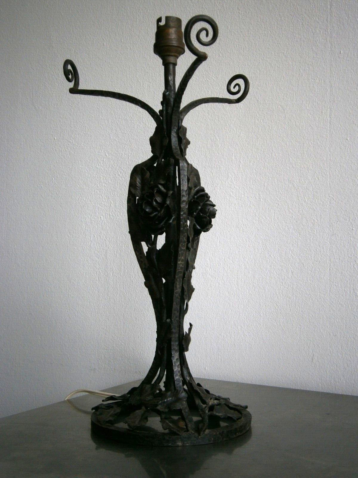 Grand Pied de lampe Art Déco Roses Fer forgé 1930 H.Chaine Luminaire Ancien