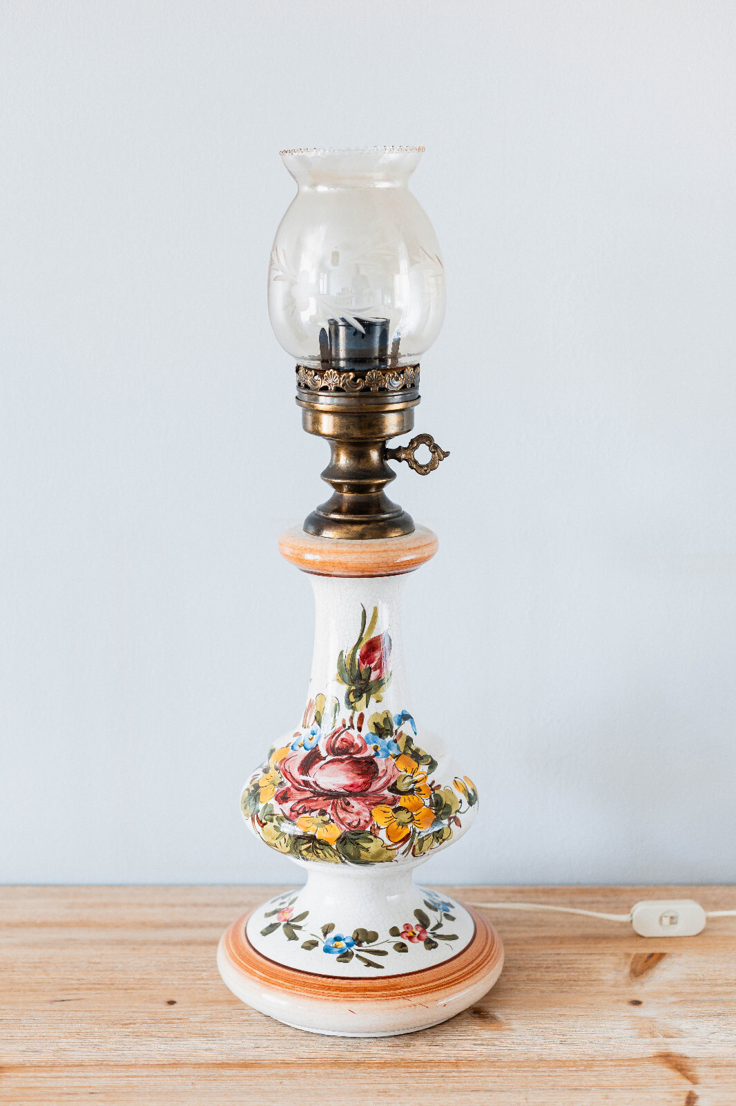 Jolie Lampe Vintage Électrique en Faîence Décor Floral Imitation Lampe à Pétrole
