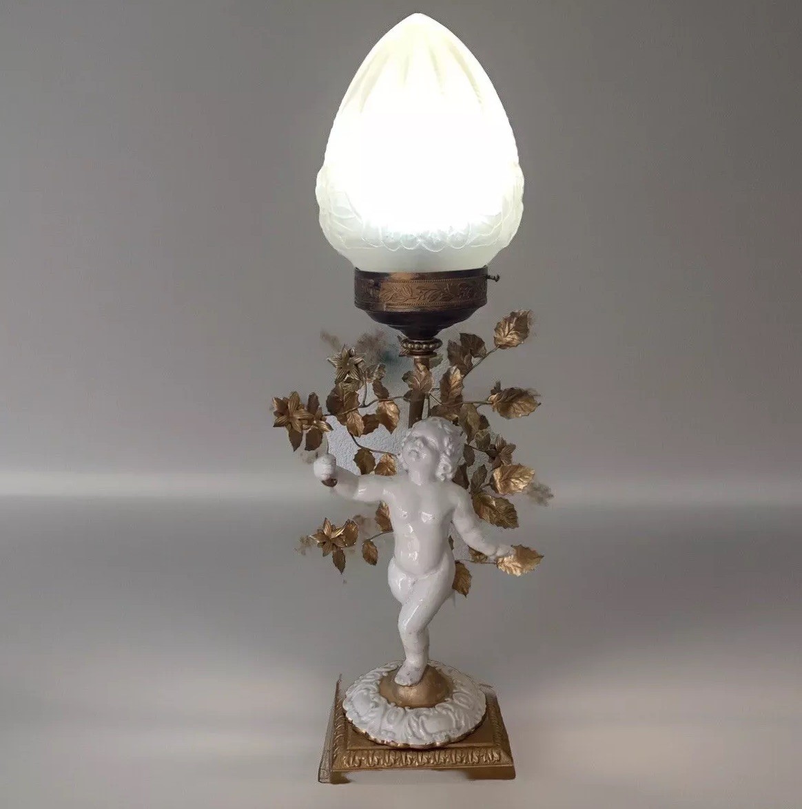 Lampe Globe Art Déco Verre Satiné Putto Blanc Céramique Ancien : Un Chef-d’œuvre de l’Époque
