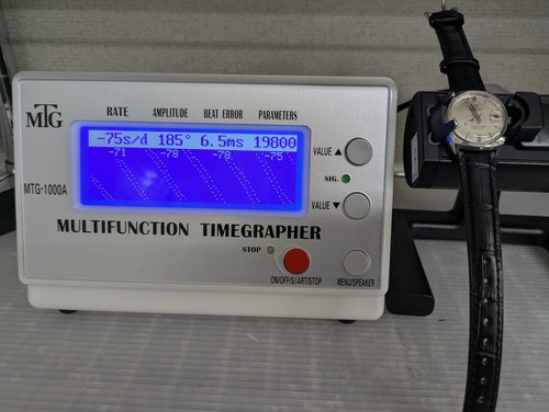 L’état de cette montre est véritablement exceptionnel. La boîte et le bracelet sont en excellent état, sans traces de usure ou de corrosion. Le cadran est intact, sans taches ni rayures. Le mouvement a été révisé et est en parfait état de fonctionnement. Cette montre a été soigneusement entretenue et conservée, ce qui explique son état près de neuf.