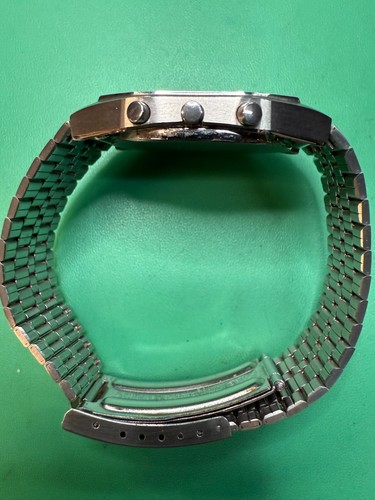 Le design du Speedmaster 1620 LCD Quartz est caractéristique de l’époque. La montre présente un boîtier en acier inoxydable de 39 mm de diamètre, avec un fond solide et un verre minéral. Le cadran est sobre et fonctionnel, avec des index et des aiguilles lumineuses pour une bonne visibilité. L’affichage LCD est positionné au centre du cadran, offrant une lecture claire et précise des informations.