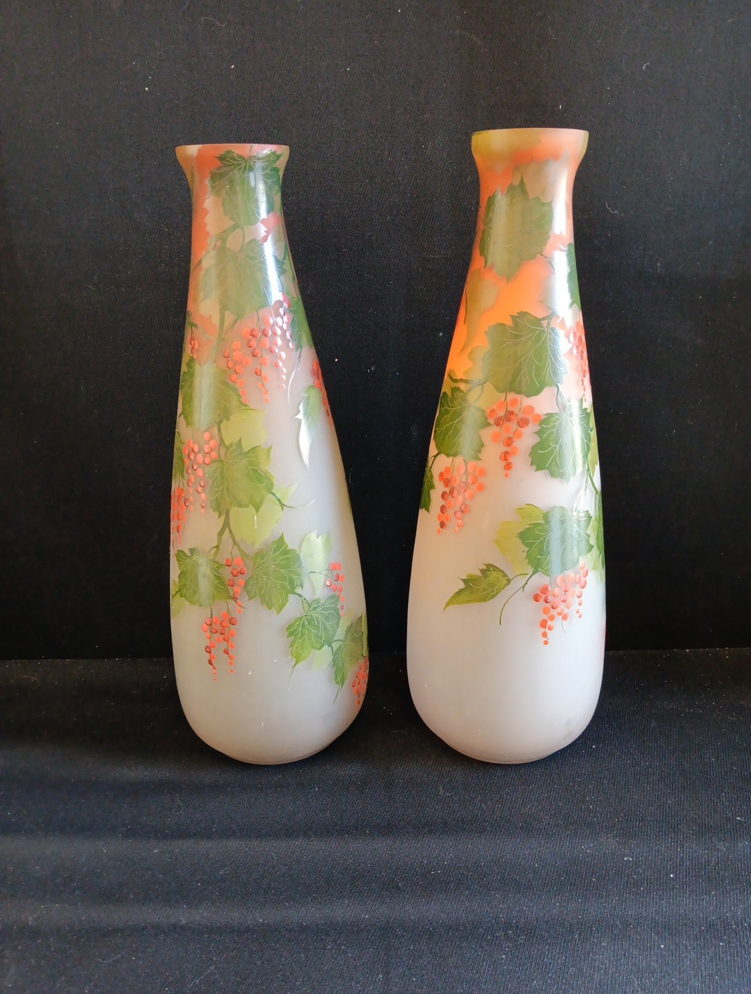 La paire de vases en question mesure 51 cm de hauteur, ce qui les rend imposants et majestueux. Leur forme élégante et leur décor de vignes les rendent particulièrement attractifs. Les vignes, avec leurs feuilles et leurs grappes de raisin, sont représentées de manière très réaliste, avec une attention aux détails qui témoigne de l’habileté et de la patience de l’artiste. La pâte de verre utilisée pour ces vases est d’une qualité exceptionnelle, avec des couleurs vives et des textures qui donnent une sensation de profondeur et de relief.