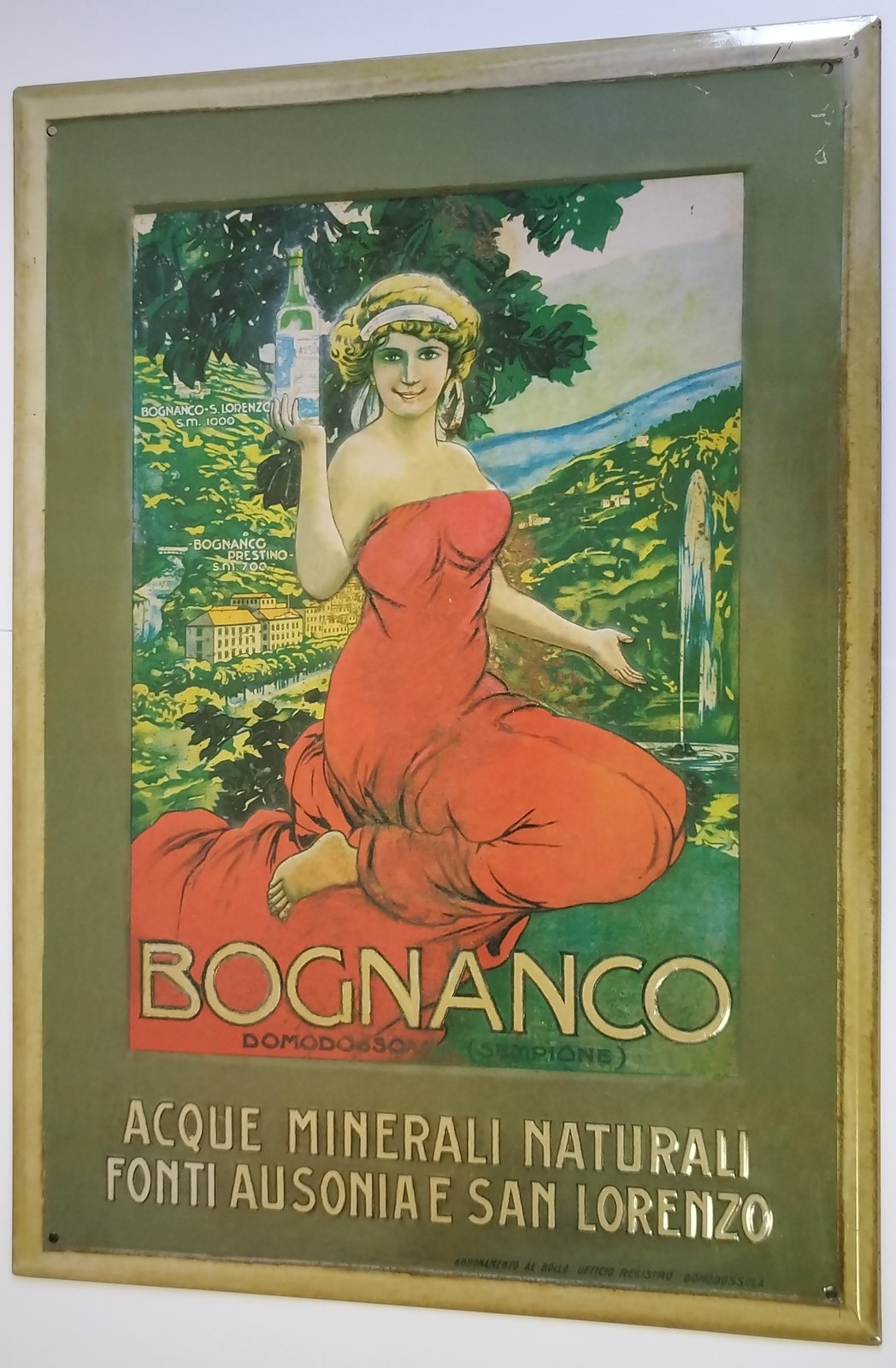 L’Hachette Eaux Minérales Bognanco, une entreprise italienne de production d’eaux minérales, a utilisé les plaques publicitaires en fer pour promouvoir ses produits dans les années 1920 et 1930. Ces plaques, généralement en fer blanc ou en fer galvanisé, étaient fixées aux murs des bâtiments, des ponts ou des supports publicitaires le long des routes. Elles portaient l’image de la marque, souvent accompagnée d’un slogan ou d’un message publicitaire.