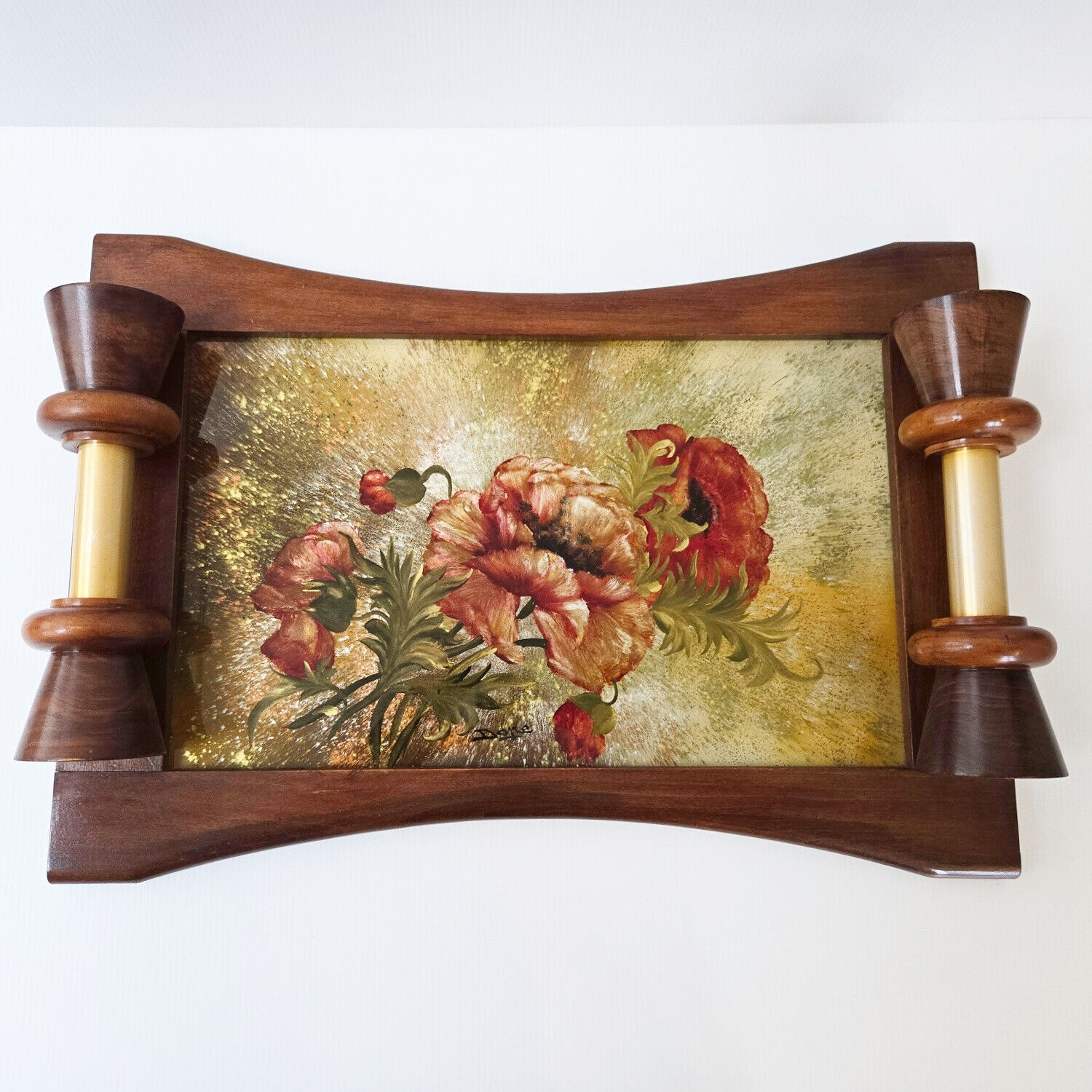PLATEAU ART DECO VINTAGE 1940 EN BOIS VERNIS & LAITON A DECOR DE PIVOINES DOPE