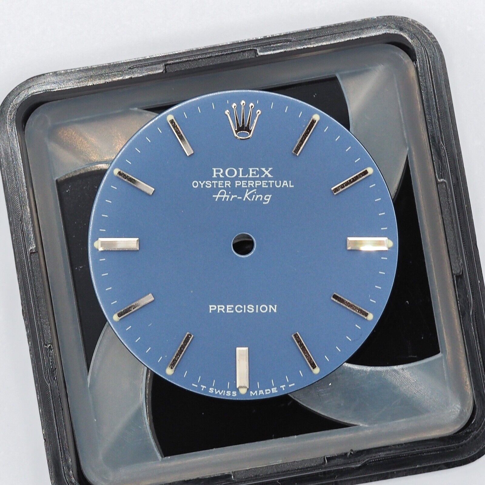 Conçu pour les pilotes et les aviateurs, la ligne Air-King a été lancée par Rolex dans les années 1950, avec pour mission de fournir une montre fiable, précise et résistante aux conditions extrêmes. Le modèle 5500, qui fait l’objet de cet article, est une variation spécifique de cette ligne, caractérisée par son cadran bleu rare et son étiquette « Precision », symboles de qualité et de performances.