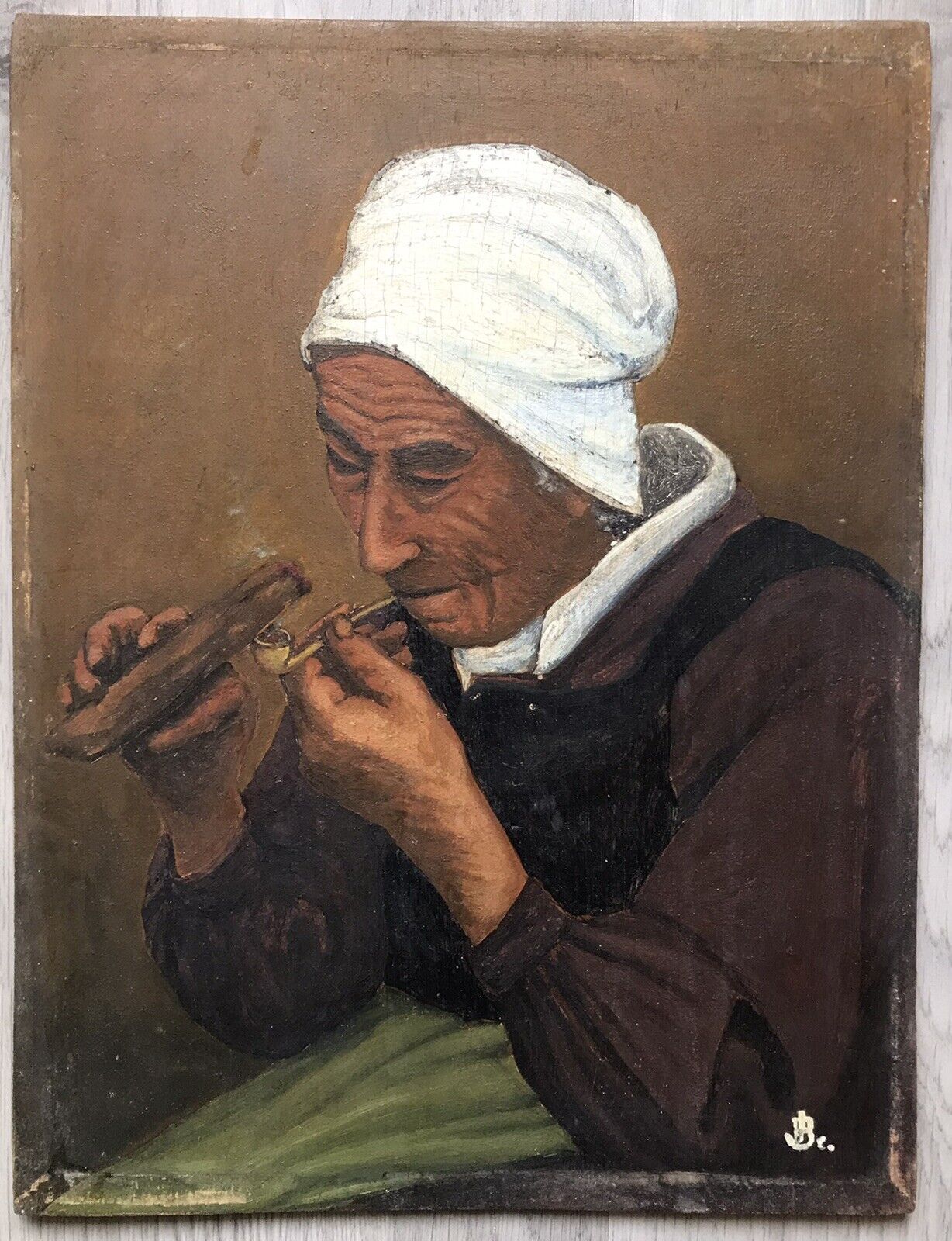 Tableau Ancien Peinture Huile Portrait Homme Tabac XIXe Siècle