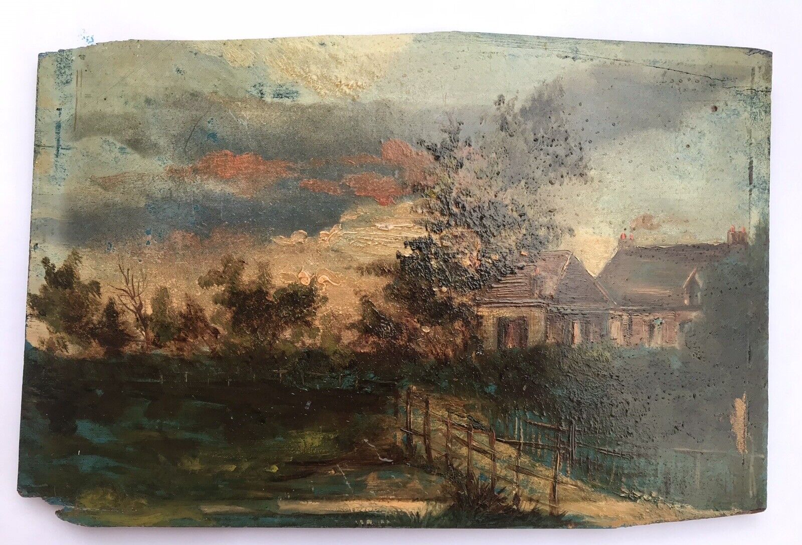 Tableau Peinture Originale Huile Paysage de campagne Maisons Arbres XIXe Siècle