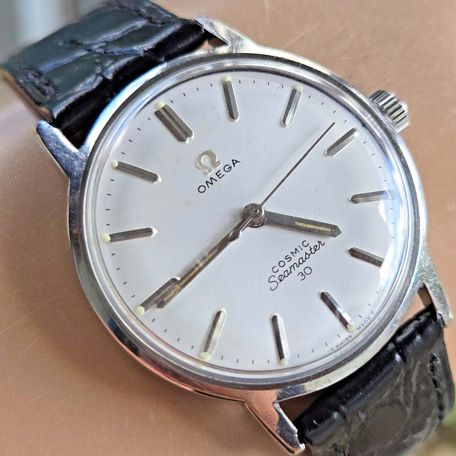 La montre présente un design classique avec un boîtier rond en acier inoxydable de 36 mm de diamètre, une taille considérée comme standard à l’époque. Le cadran est simple et élégant, avec des indices et des aiguilles en forme de feuille, typiques des montres OMEGA de cette époque. La couronne est petite et permet un remontage manuel du mouvement, tandis que le verre est en plexiglas, un matériau couramment utilisé pour les montres dans les années 70.